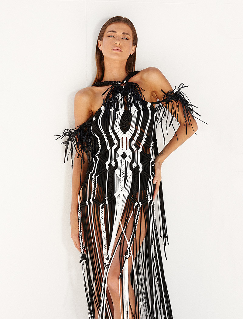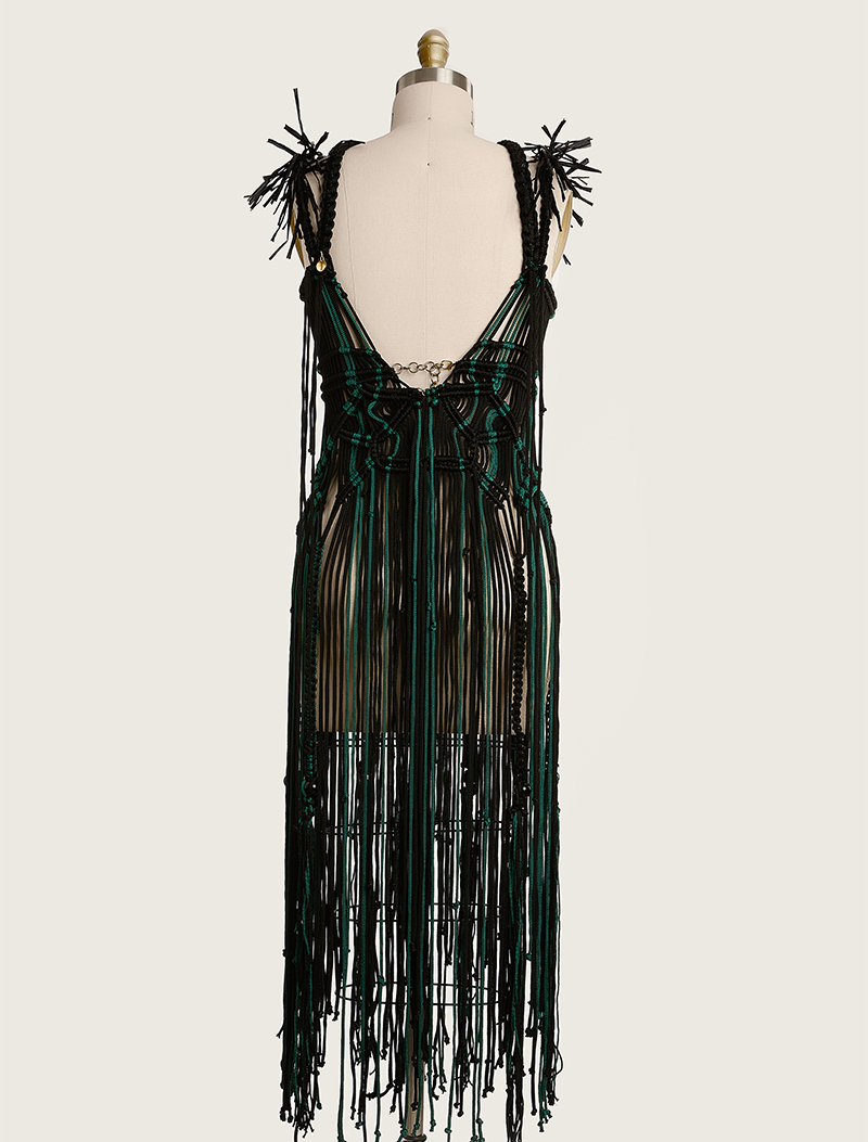 Chlamis-2 is a handmade macrame dress, with a silver ring on the chest, raffia tassels on the shoulders, braids at the ends, and acrylic beads on the edges. Available also without the raffia tassels.Image features black and green color with black beads.