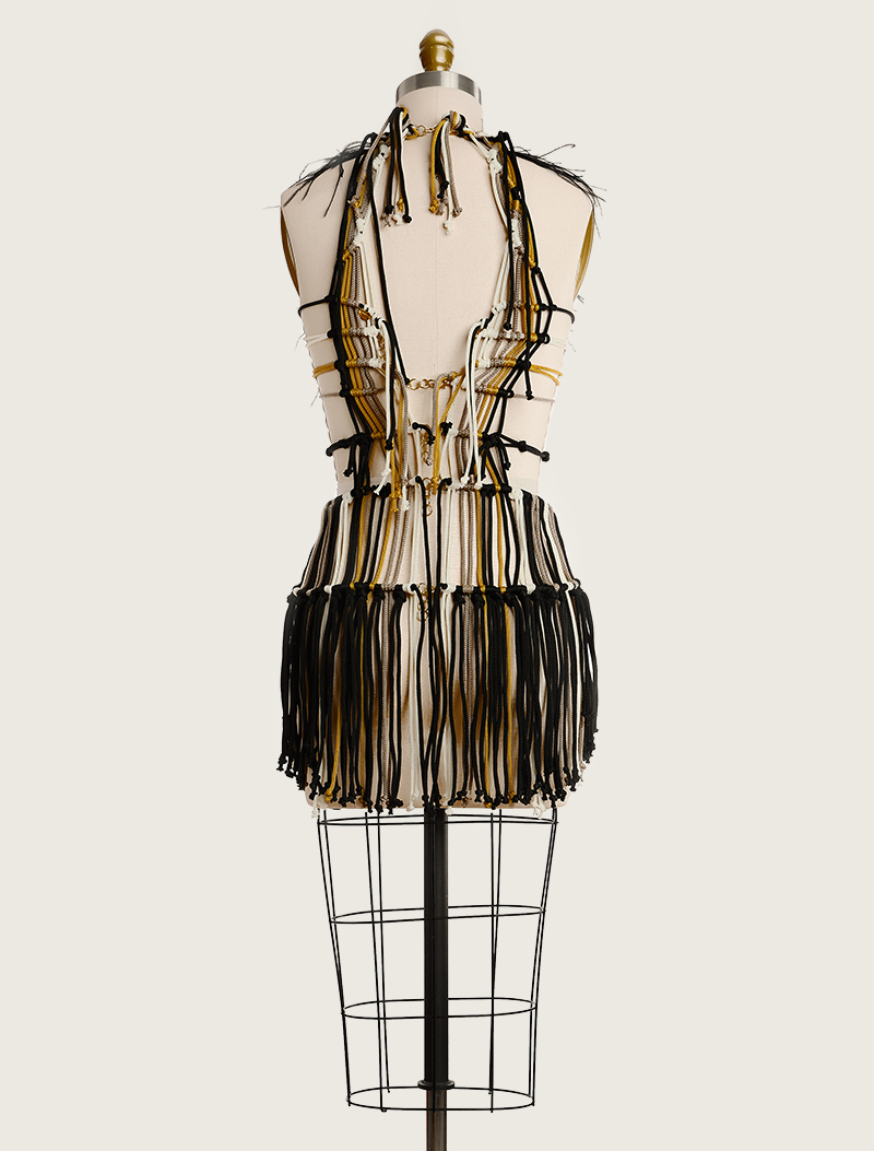Dynamis is an eccentric macrame cut-out mini dress with hand knotted bustier, ostrich feathers on the chest, and double tassels on the hips.