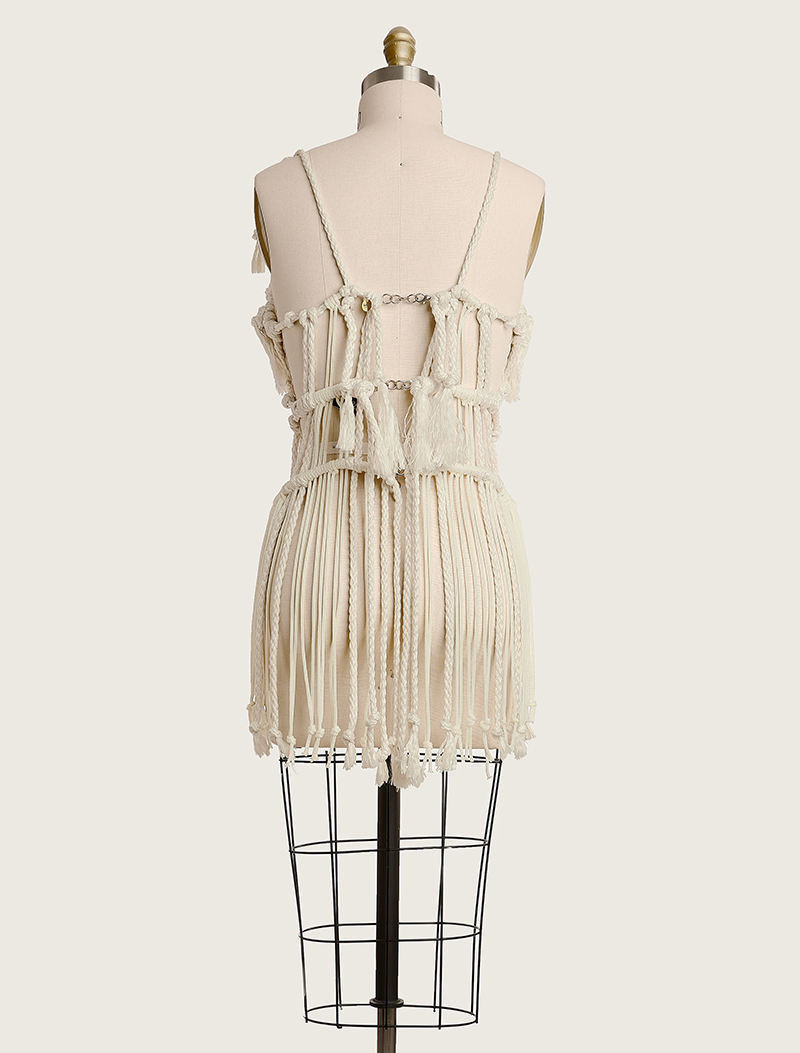 Funis is a hand knotted mini dress made with thick rope, embellished with double knotted tassels on the bust and trimming ends.