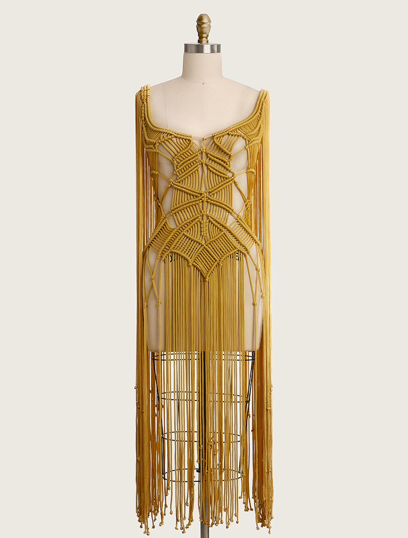 Helious is an exceptional design of macrame dress, exposing great hand knotted details on both the front and back with fully knotted body shape, and hand knotted sleeves with long tassels.