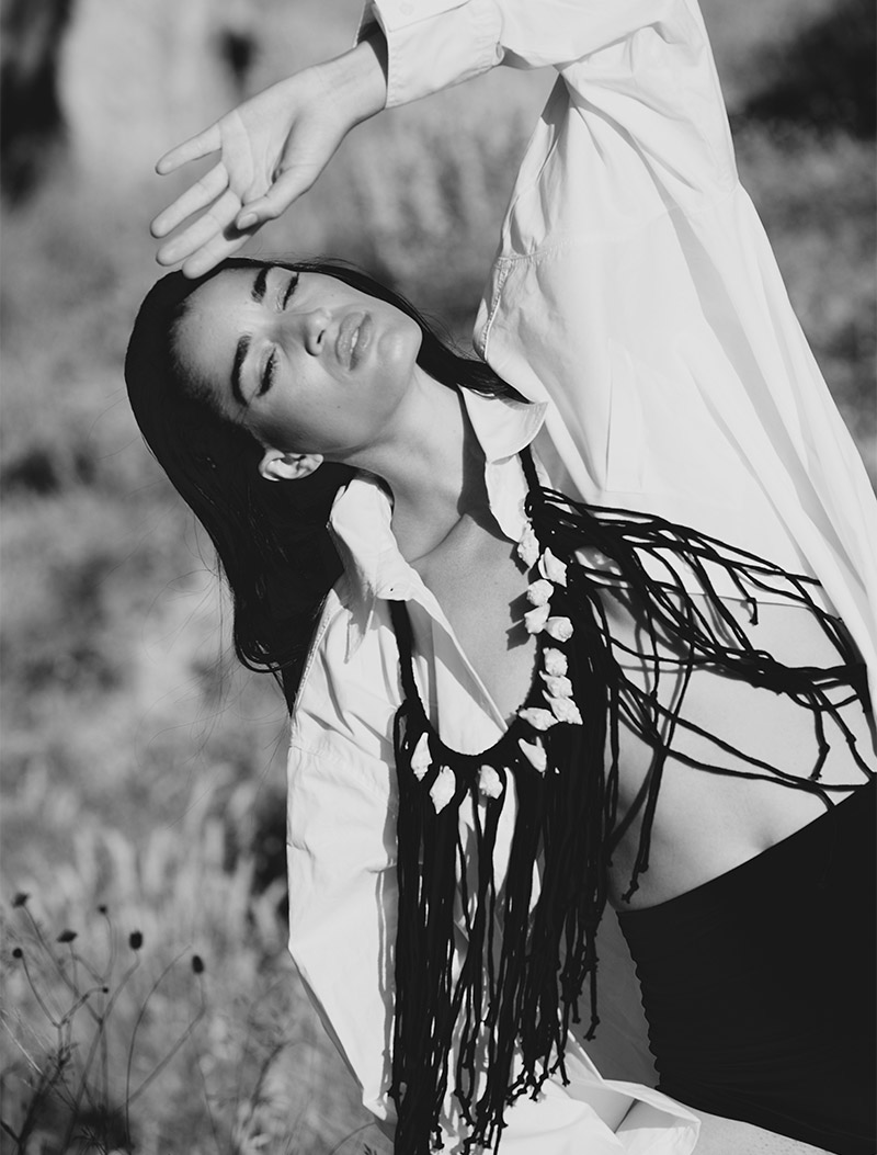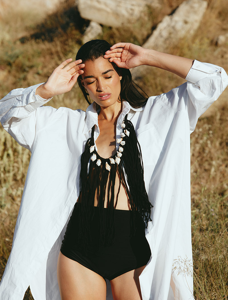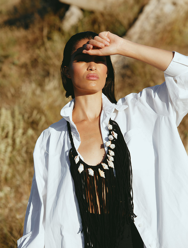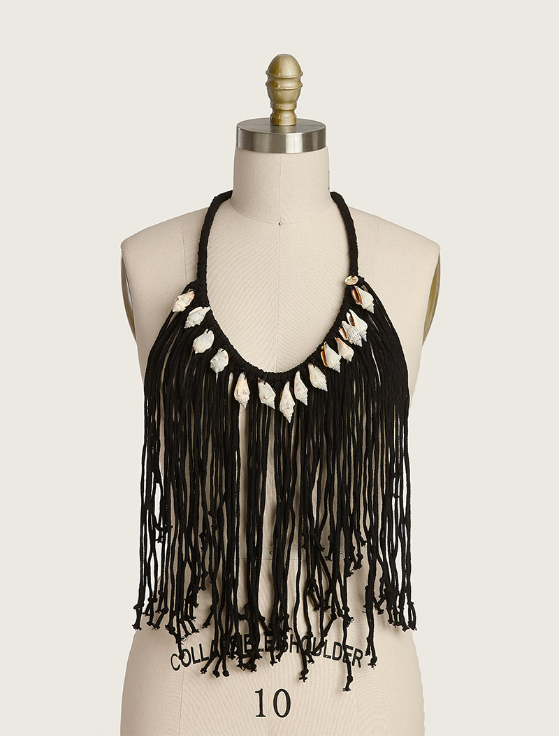 Shell is a handmade necklace embroidered with seashell beads across the neckline and tassels covering the bustier till the waist.