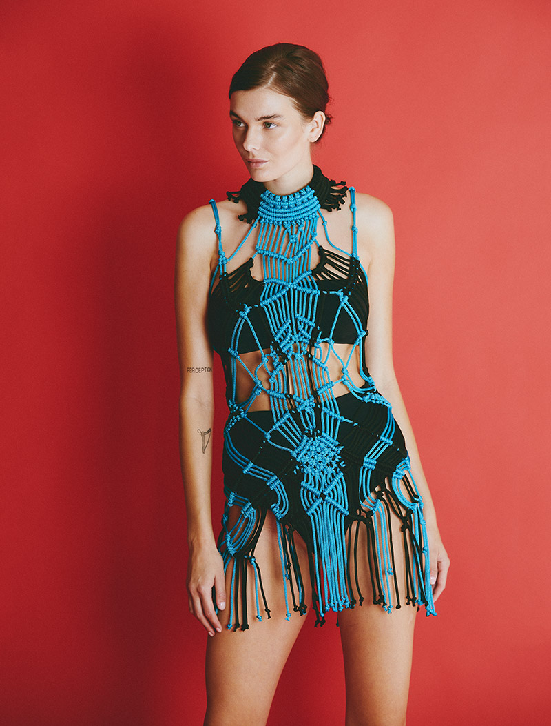 Shibary is a hand knotted mini dress designed with a lot of cut-outs exposing the silhouette, fully knotted on its lower front part and with a chocker neckline.